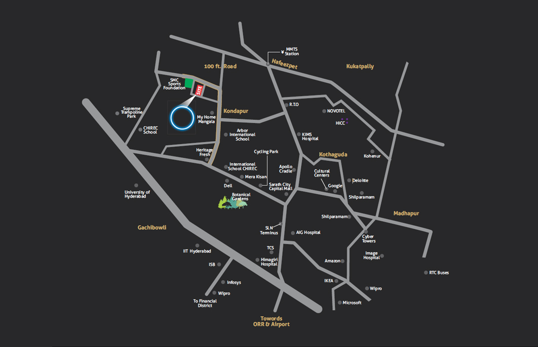 Kohenur, IKEA, Shilparamam, Cultural centers and more., Cycling park, Radisson Blu Hotel, Le Meridien Hotel, Trident Hotel, Sarath City Capital Mall